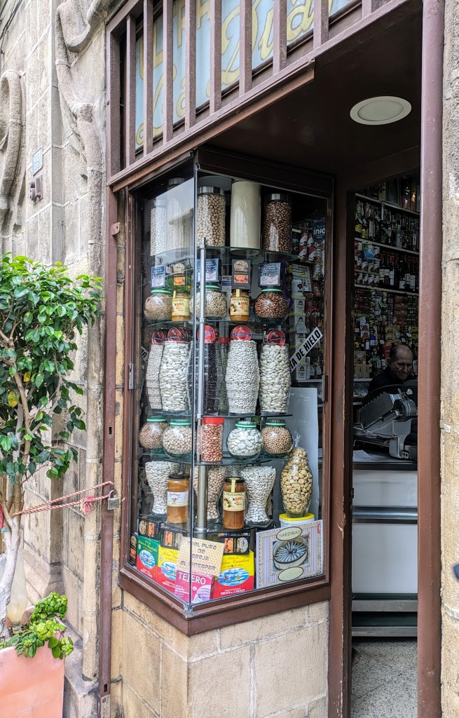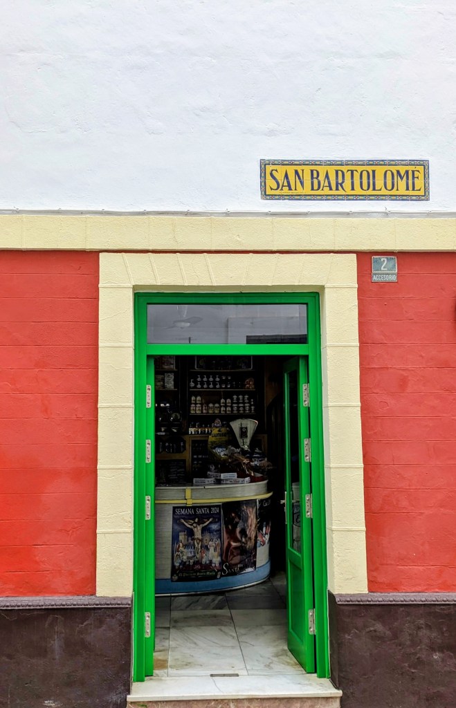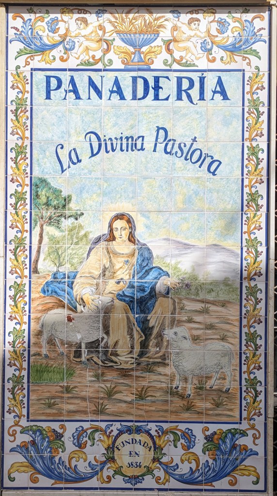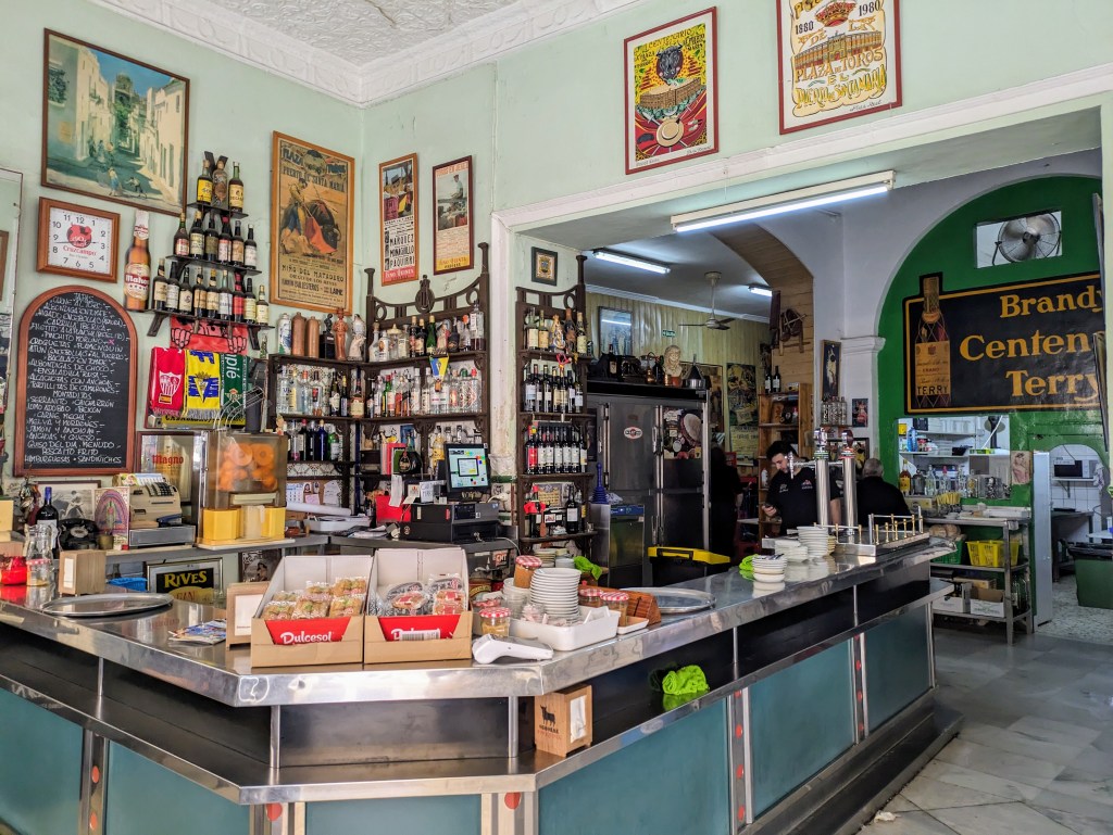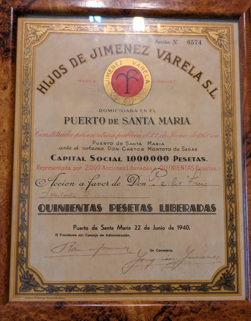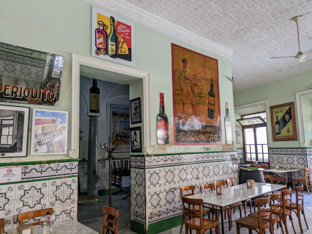 We stopped at this tiny bar (hole in the wall) to try their casero vermut. There were a couple of very old guys holding up the bar drinking a glass of sherry but not much else was happening. The barman showed us a bottle of gin explaining it was the “magico”, as he poured half a glass of gin before topping it up with vermut. As we drank our very strong vermut we noticed this certificate on the wall which we believe is a business registration from 1940 for the Hijos of Jimenez (children of Jimenez) Varela S.L. We thought it was something about a social club but after further research discovered that the SL in Spain, stands for Sociedad Limitada, is a private limited company suited for most small and medium size business. Where it says “Accion a favor de Don” the writing is faint but we think it says Don Pedro Luis … not sure of the next name and then Jimenez. Finishing our vermut, we could hardly walk to the next bar!