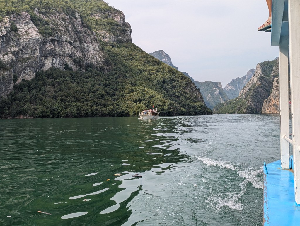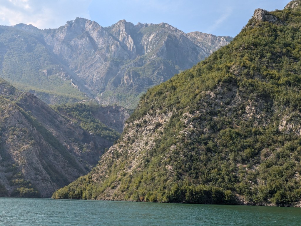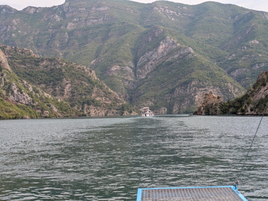 Our amazing Airbnb host Max booked a day tour to Shala River for us. It’s a popular destination and one we had read about. We decided to wait until September hoping it would be less busy. It was a big day as we left at 630am on a minibus to catch the ferry on Komani Lake which would take us to Shala River. The road to the ferry depot was very bad and we were very happy that we had decided not to take Freddy as I don’t think he would have survived. After 2 hours we arrived at the Komani Lake ferry port. The lake is actually a dam on the Drini River and the port is right next to the dam wall. We had to walk through a tunnel to reach it.