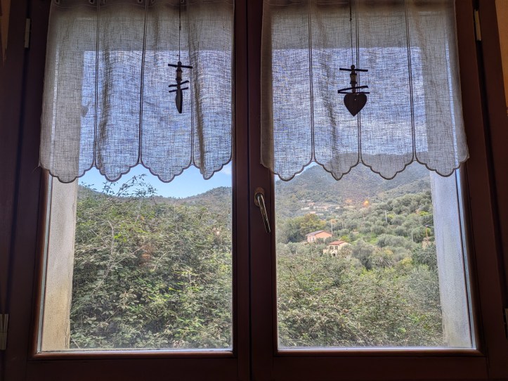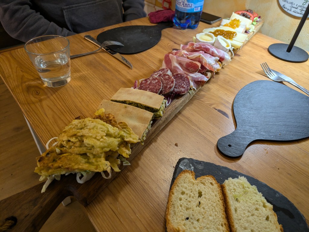 We ate dinner in the evening, and it was simple but very, very good. Everything was homemade and sourced from their farm or local producers. We enjoyed ravioli with borage flowers and homemade pesto, a large platter of products from local farms, or products such as goat, sheep, and local cow cheeses and naturally bred Ligurian cured meats, and vegetable specialties. We finished off with an amazing sorbetto al limone. Although the meal was very simple, it really was delicious and one of the best we have had.